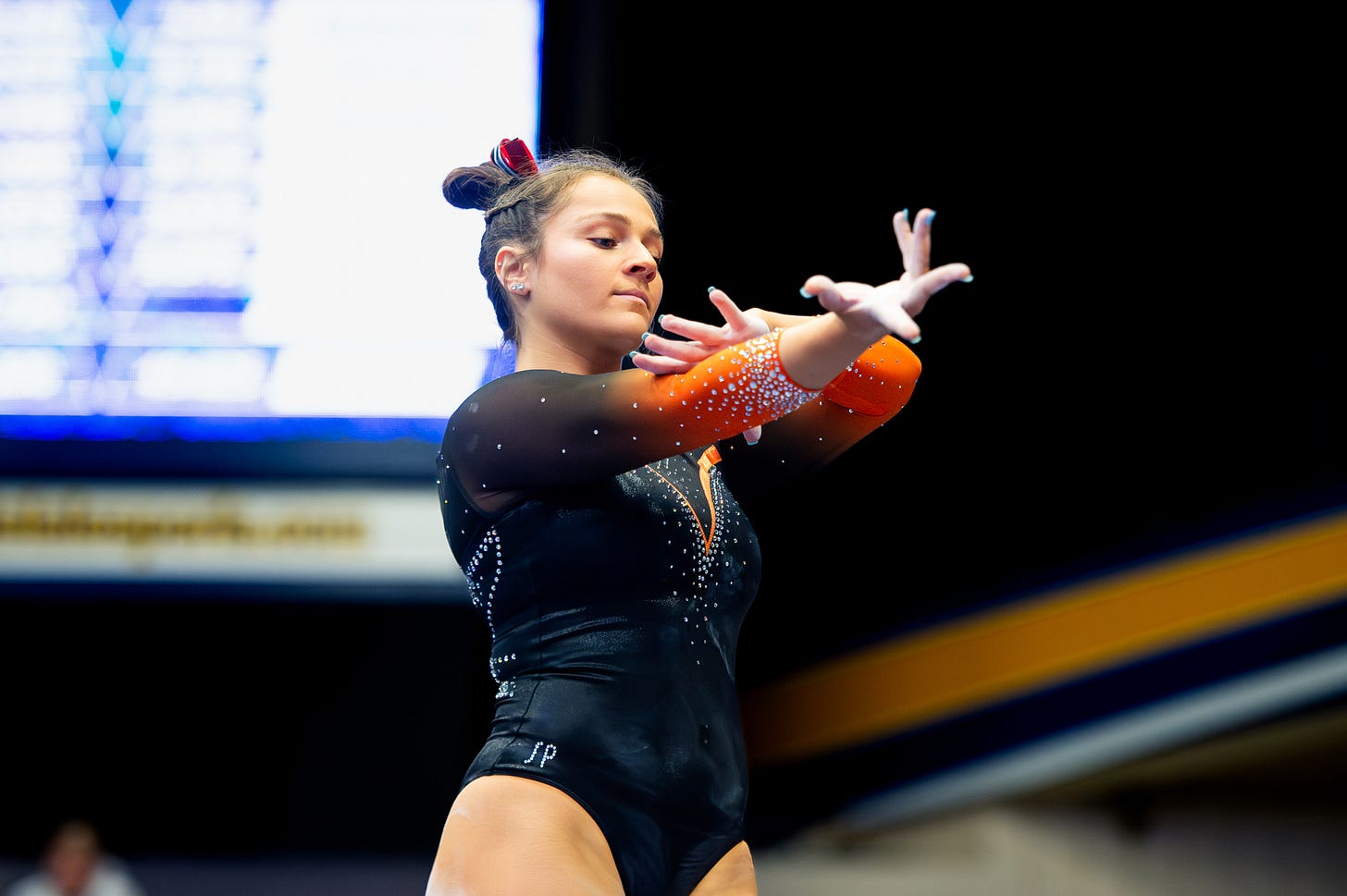 In the final rotation, the Golden Flashes combined for a 49.600 on the exercise floor to claim all 4 event titles over the Falcons, who combined for a 48.800 on the balance beam. Freshman Dani Fuertez claimed the 1st place throne on the floor for the 4th time with a career-best 9.975, while Akpan, Brzoska and freshman Nadia Parente each tied for 2nd with a 9.850.